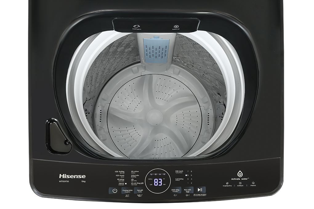 Máy giặt Hisense Inverter 15 kg WT150F50 mang phong cách hiện đại, màu sắc trung tính dễ phối với nhiều không gian như phòng giặt, ban công hay khu vực phơi đồ. Thiết kế cửa trên mở hướng lên giúp thao tác thoải mái, không cần khom lưng khi lấy hoặc cho quần áo vào máy, rất tiện cho gia đình có người lớn tuổi.
