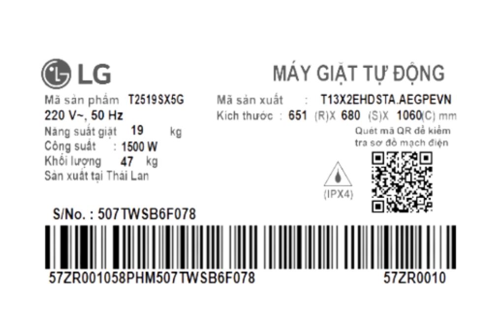 Thông số kỹ thuật Máy giặt LG AI DD Inverter 19 kg T2519SX5G