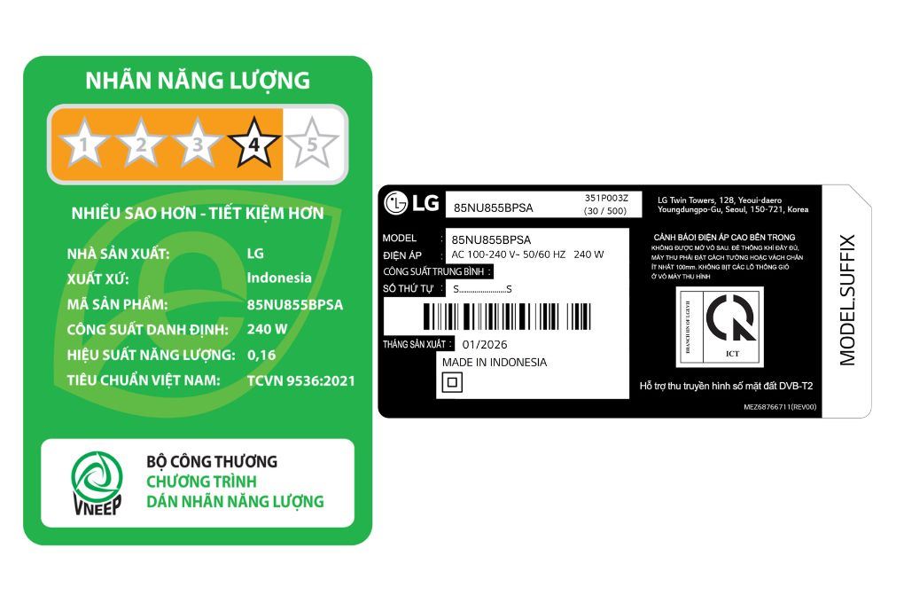 Thông số kỹ thuật Smart Tivi LG AI 4K 85 inch 85NU855BPSA