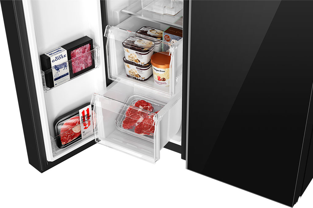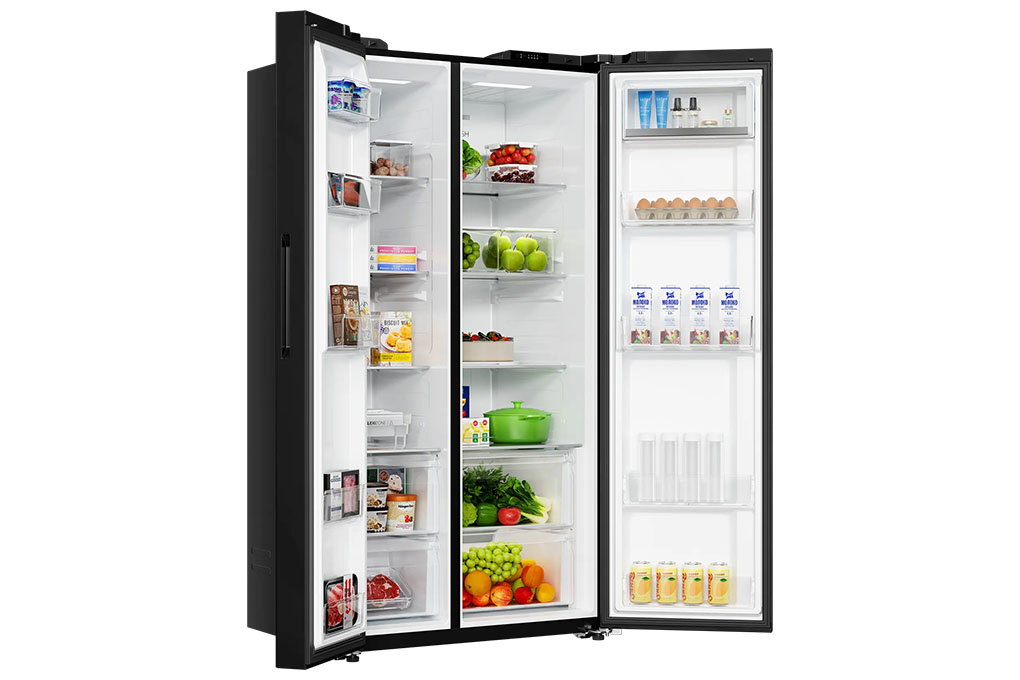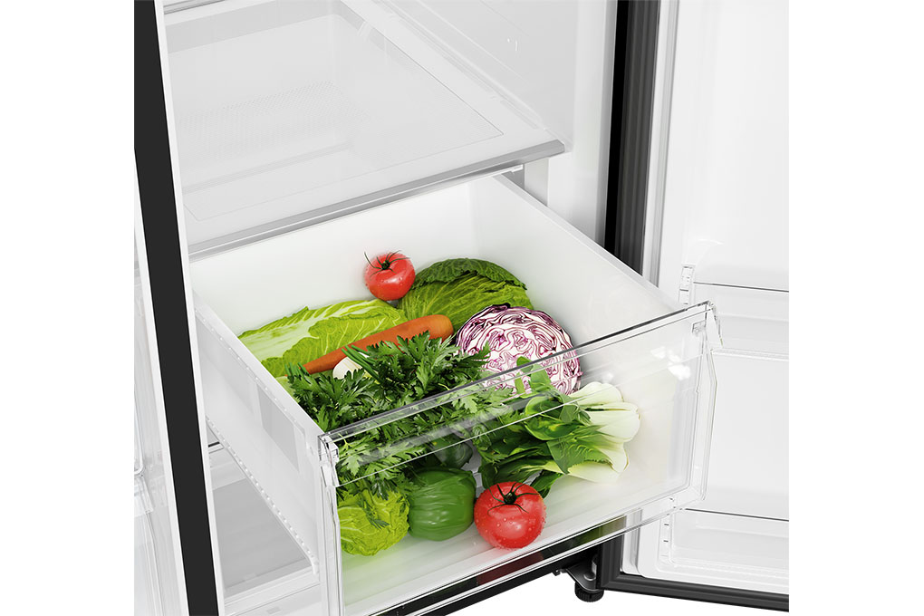 – Ngăn lạnh dung tích 438 lít: có các ngăn kệ, ngăn đựng thực phẩm tươi và ngăn đựng thực phẩm khô. Ngoài ra, mỗi bên cánh cửa tủ lạnh cũng được thiết kế thêm khay chứa. Ngăn rau củ quả được chia thành 2 ngăn: 1 ngăn đựng thực phẩm tươi và 1 ngăn đựng thực phẩm khô, có khả năng duy trì được độ ẩm chuyên biệt để giúp bảo quản thực phẩm được tốt hơn.