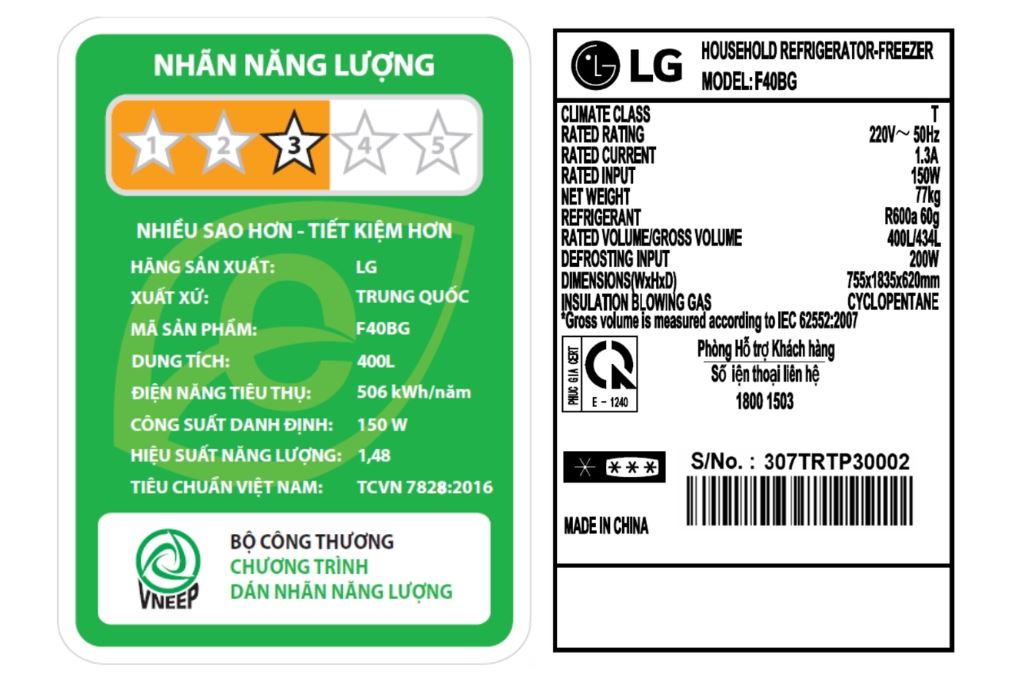 Công suất tiêu thụ khoảng 506 kWh/năm, một con số cực kỳ ấn tượng đối với dòng tủ lạnh dung tích lớn, giúp gia đình bạn tiết kiệm đáng kể chi phí vận hành.