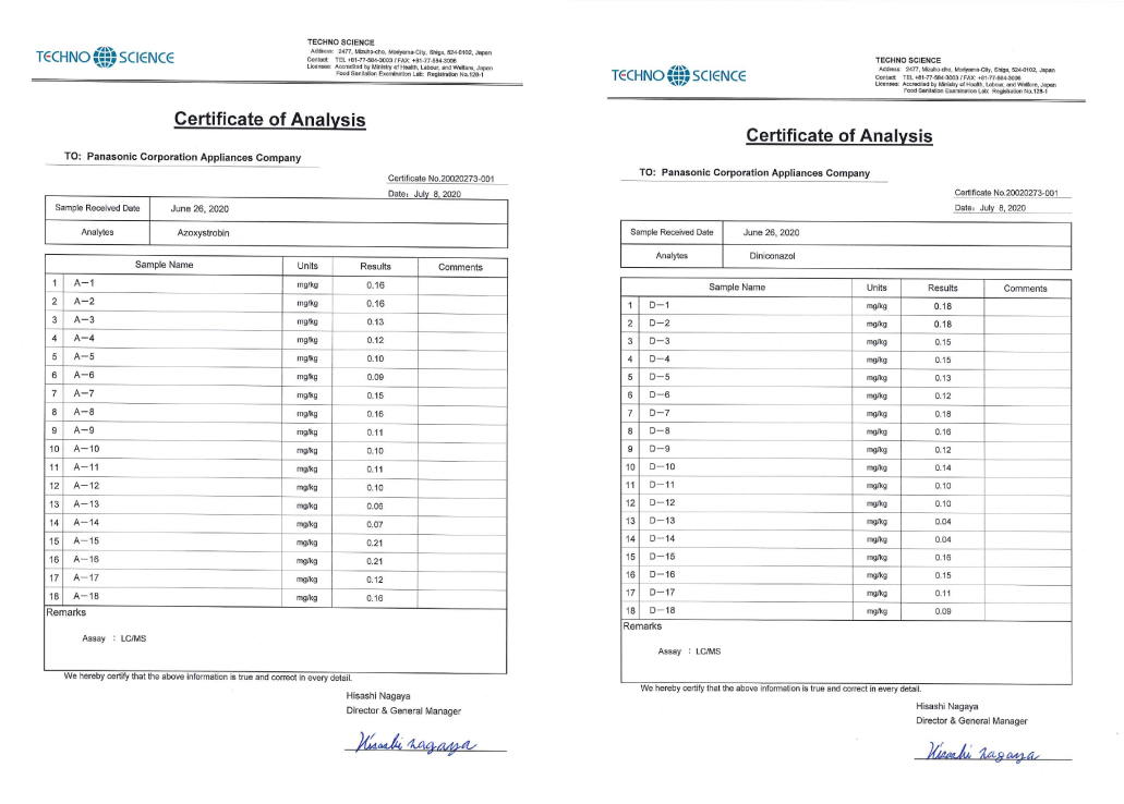 Giấy chứng nhận của tổ chức Accredited by Ministry of Health, Labour, and Welfare, Japan đánh giá về hiệu quả khử khuẩn, khử mùi của Nanoe-X trong tủ lạnh ở phòng thí nghiệm.